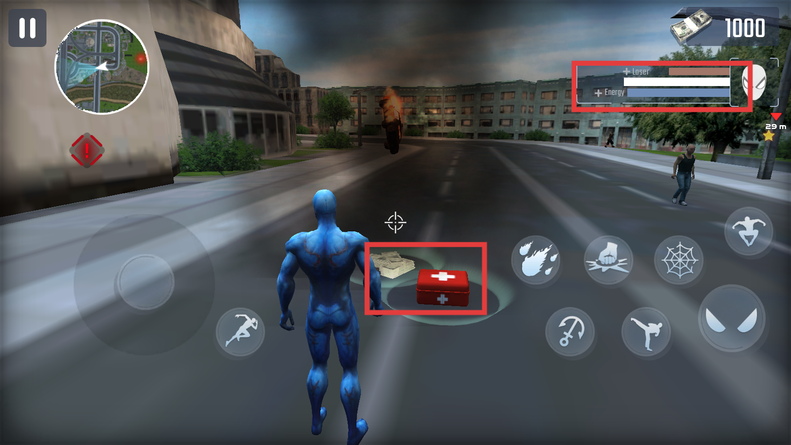 3、拾取场景内【急救箱】(恢复状态)、金钱,关注右上角【Laser】(攻击条)与【Energy】(能量条),平衡战斗消耗。