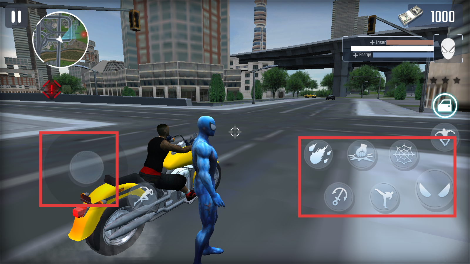 2、战斗中左侧【虚拟摇杆】控制移动,右侧技能图标(火焰、拳击等)组合释放,拦截如“骑摩托罪犯”等目标。