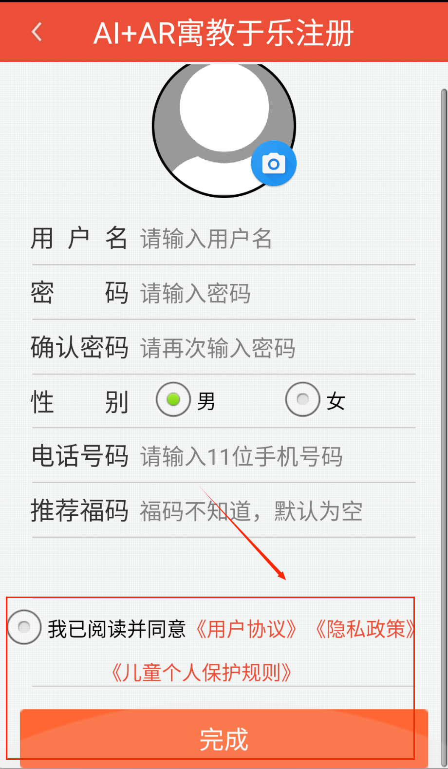 2、注册时要填用户名密码和手机号,别忘了选性别和上传头像呢。最后勾选同意协议,点橙色完成按钮就搞定啦。