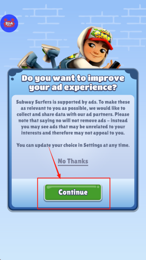 4、在广告体验询问页选择“Continue”接受个性化广告,或选“No Thanks”拒绝,即可正式开始游戏。