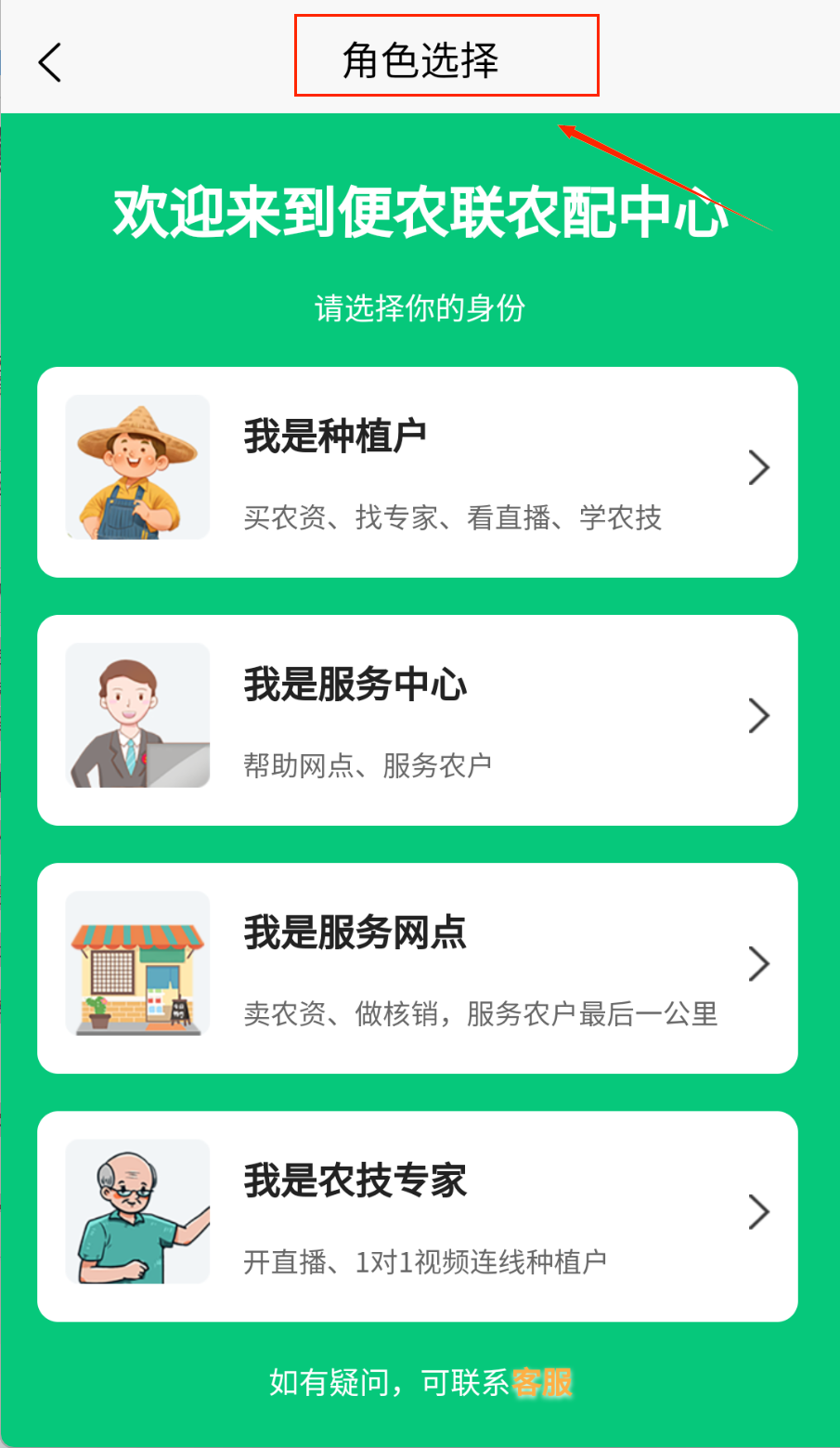 1、打开软件先选择身份呢,有种植户、服务中心等四个选项。根据自己实际情况选一个合适的身份,别选错了哦。