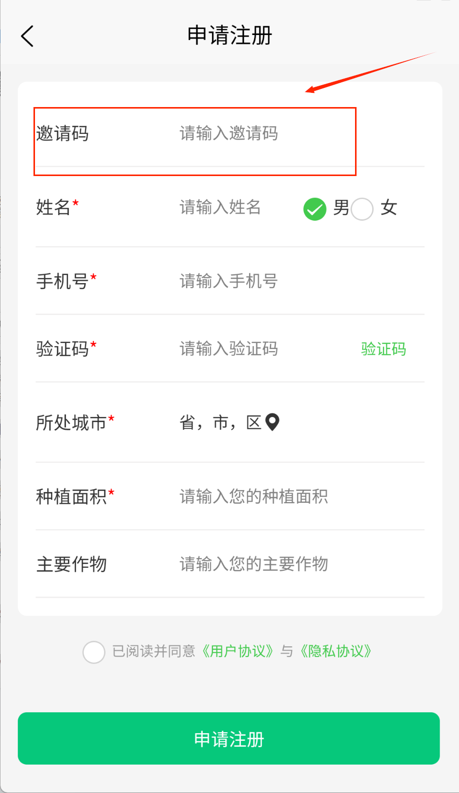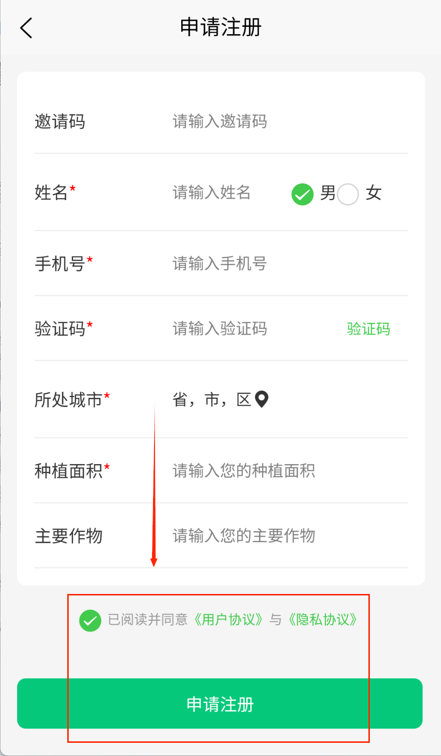3、手机号填完要获取验证码,收到后及时填写。最后选择所在城市和种植信息,勾选同意协议就能完成注册啦。
