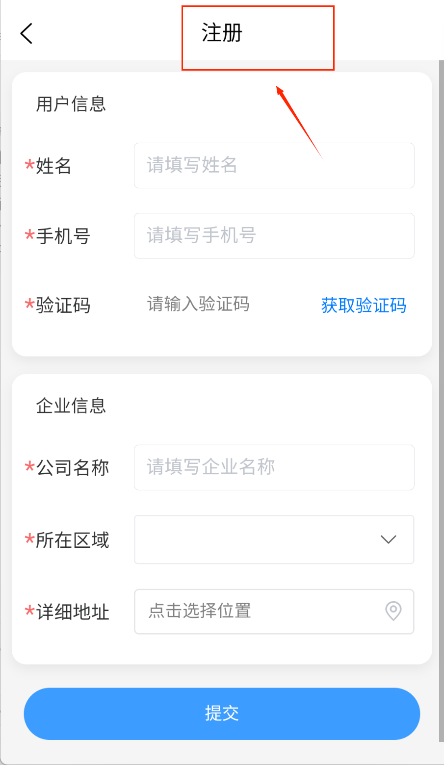 3、企业信息部分要填公司名称和详细地址,所在区域可以下拉选择。定位功能可以帮助准确选择企业位置。