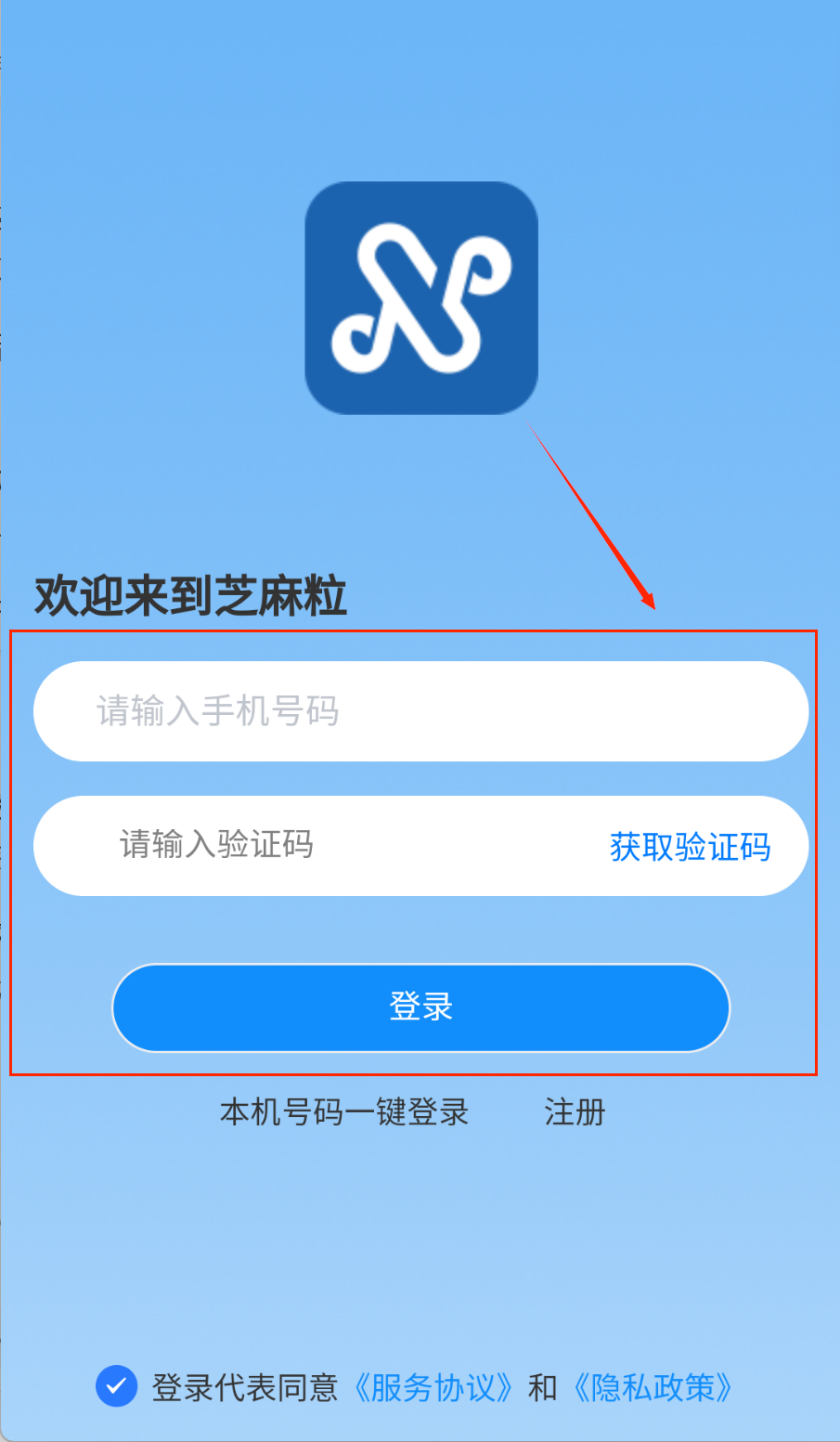 1、打开软件看到蓝色登录界面呢,输入手机号获取验证码。记得先阅读服务协议和隐私政策,了解相关条款内容。