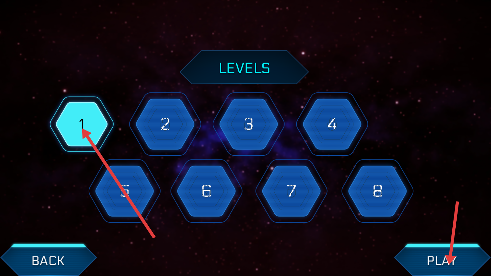 1、选【LEVELS】界面中高亮的【1】关卡-点击右下角【PLAY】按钮开启首关挑战。