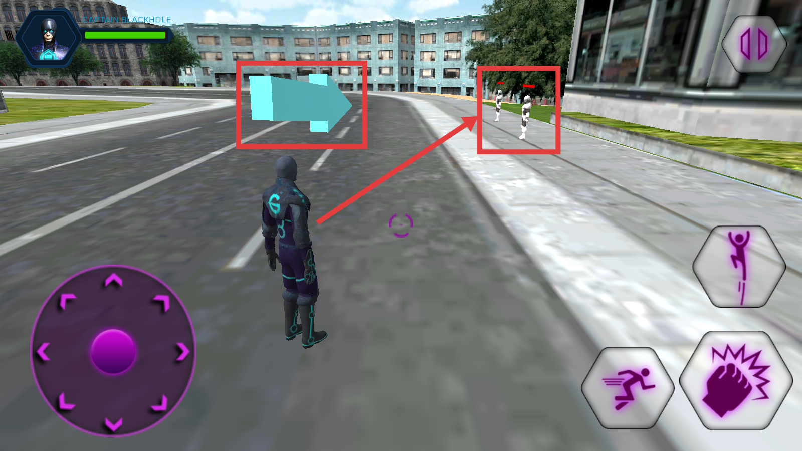 2、左侧紫色圆盘为移动摇杆-控制角色走位,右侧按键可触发跳跃、攻击,先熟悉操作逻辑。