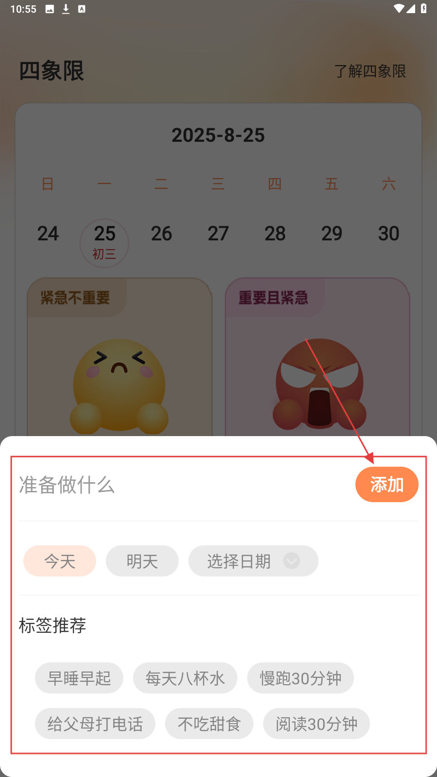 4、在四象限任务添加框,填内容选日期挑标签,点【添加】,分类管理每日任务。