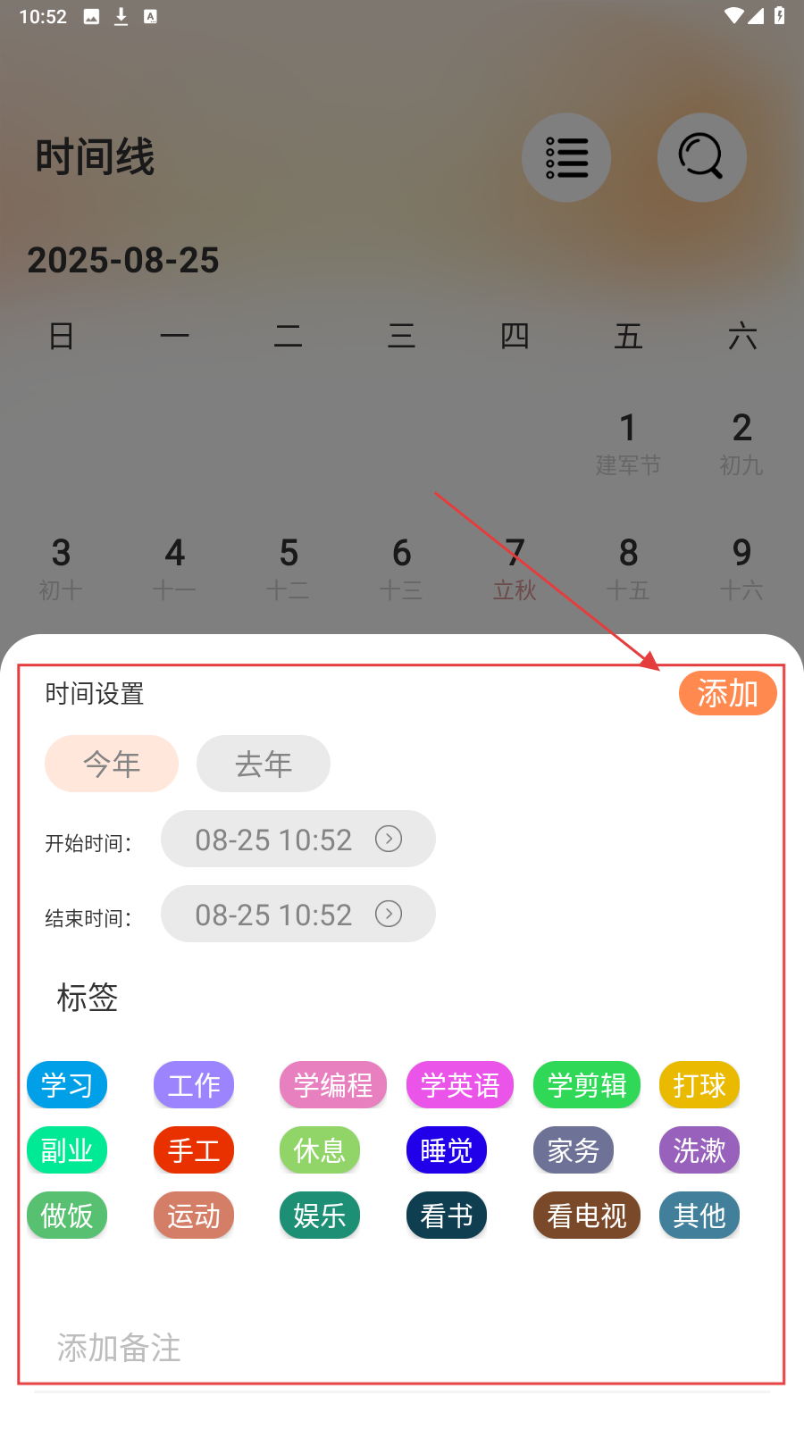 2、弹出【时间设置】框,选时间、贴标签填备注,点【添加】完成事件创建,管理时间。