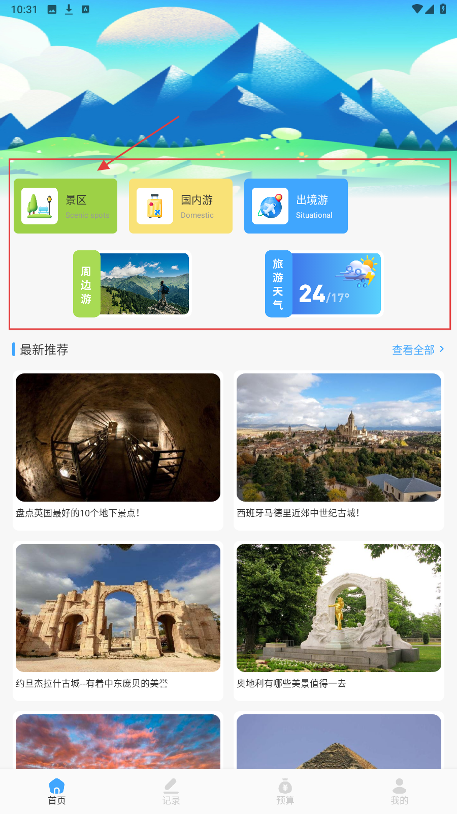 1、在首页选【景区】板块,进入景区推荐页,可浏览各类景区信息。
