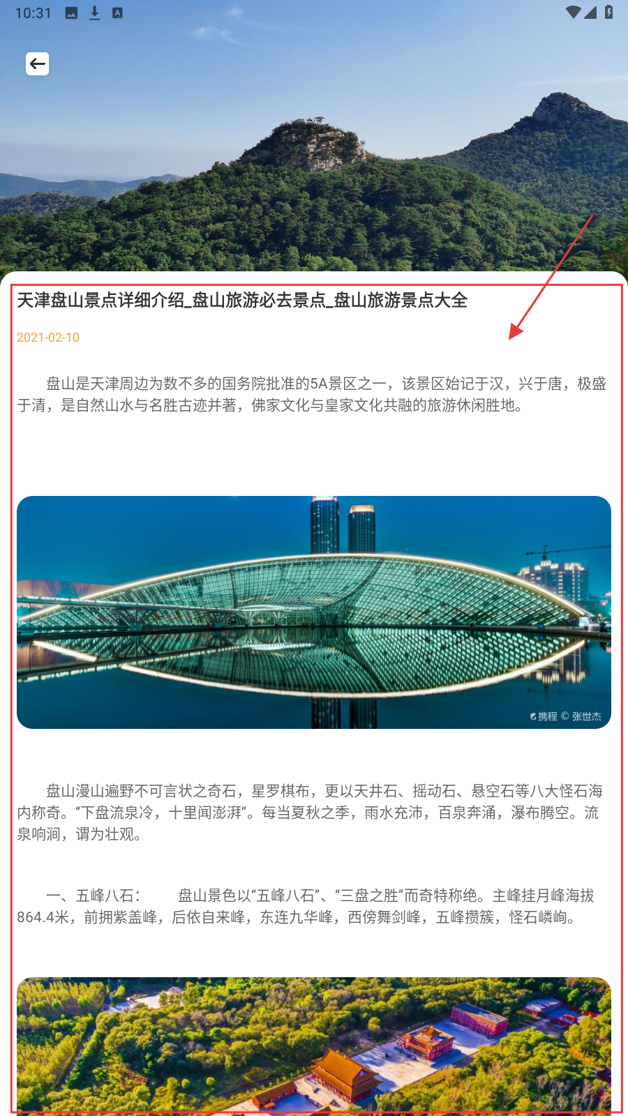 3、点选【天津盘山景点详细介绍】,阅读景区历史、景观特色等内容,了解游玩信息。