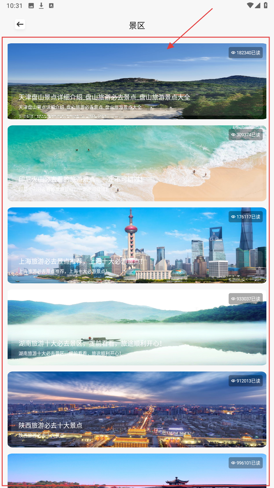 2、进入【景区】页后,查看如【天津盘山】【印尼火山】等景区列表,按需点选详情。