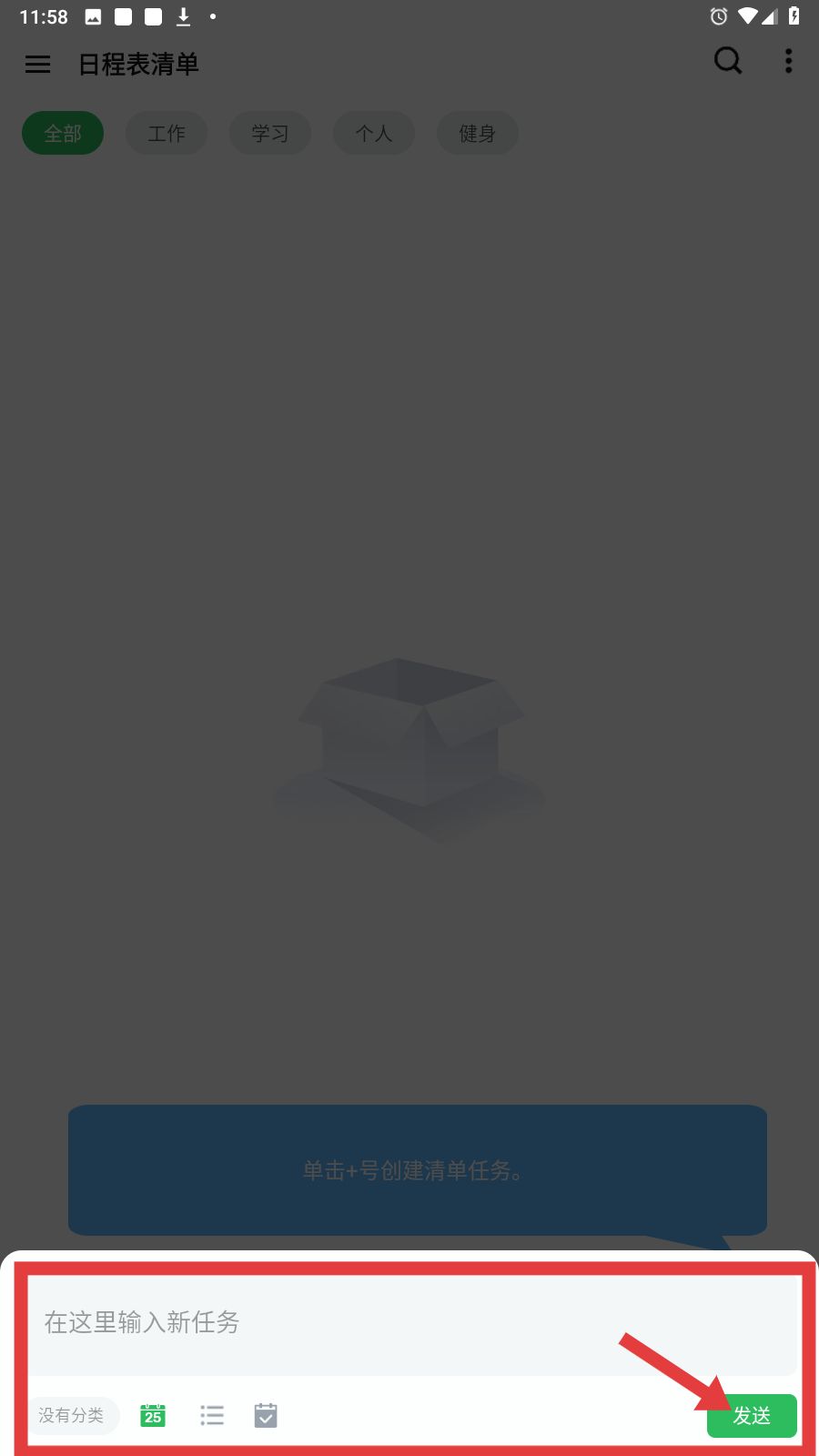 2、在输入框填新任务内容,选分类后点【发送】,完成任务创建。