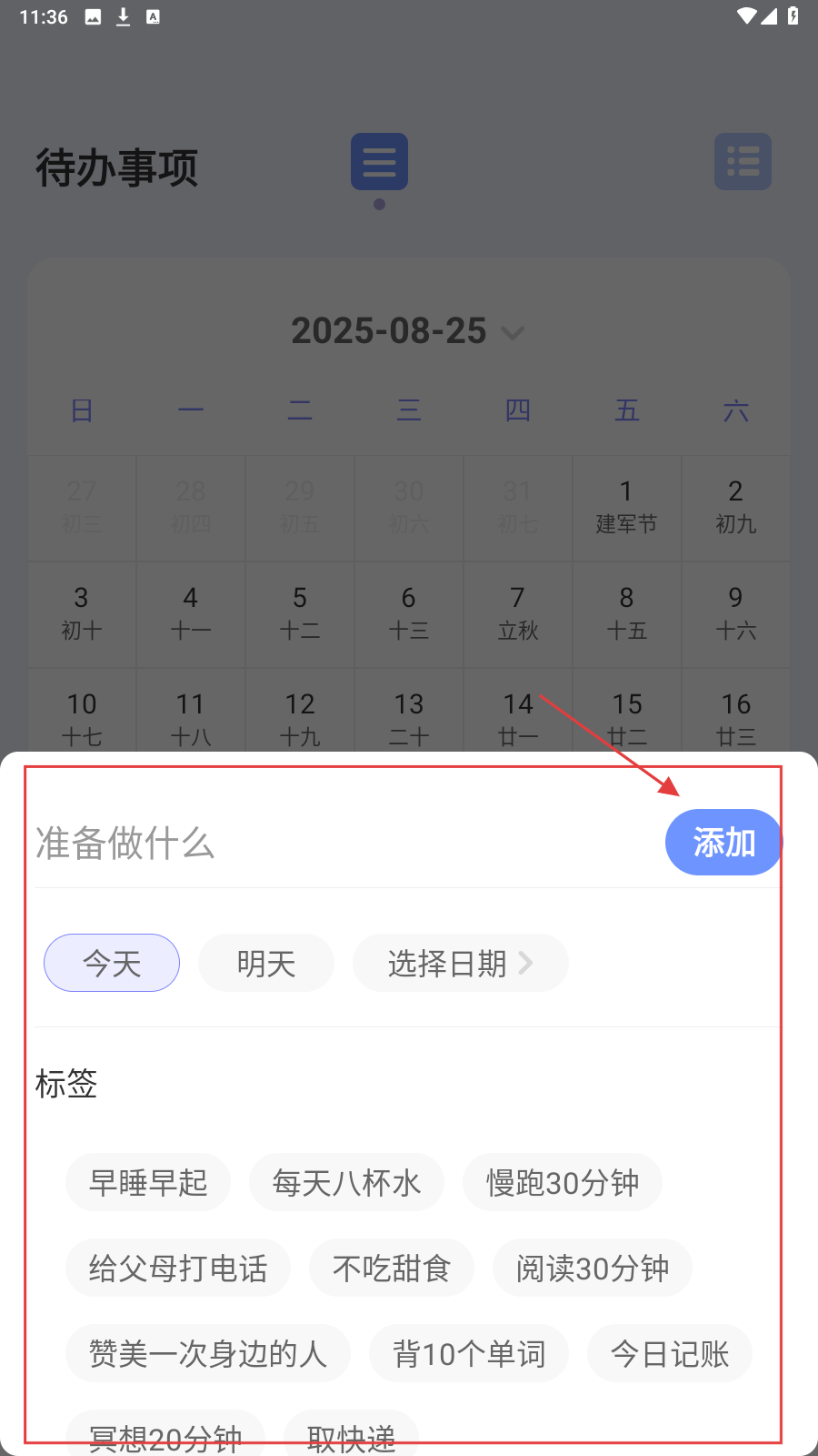 2、弹出待办添加框,填内容选日期贴标签,点【添加】,记录待办事项。