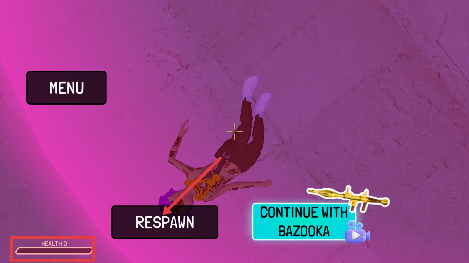 4、HEALTH归0后-点【RESPAWN】复活重战,或选广告项领火箭筒继续。