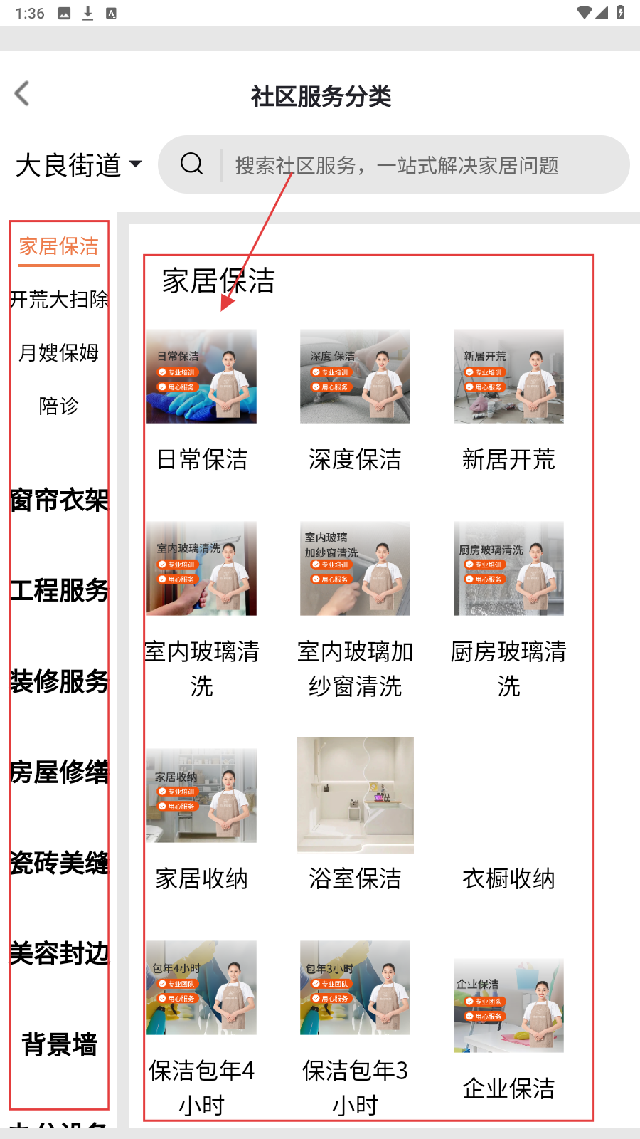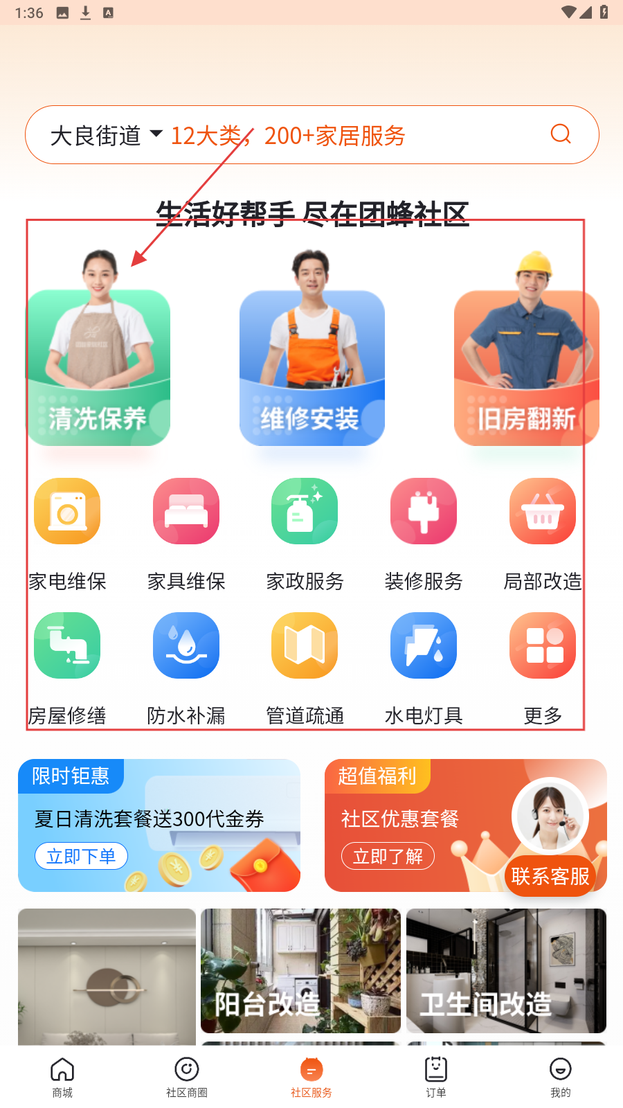 1、在【社区服务】页,选所需服务类别,如【清洗保养】,进入服务分类。