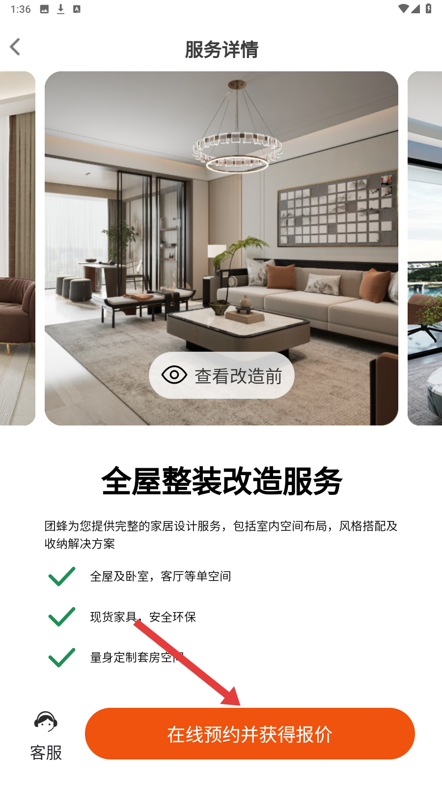 3、若选全屋改造,点【在线预约并获得报价】,提交需求。