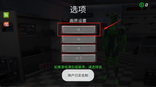 3、进入“选项”界面,将画质设为“低”以避免卡顿,然后返回主菜单。