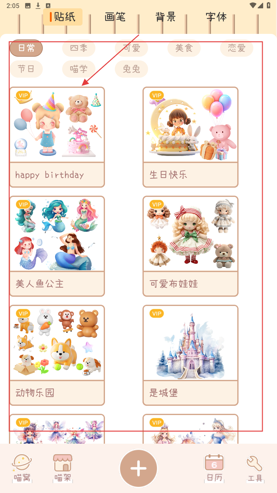 4、点选贴纸组,若需VIP贴纸,确认后点【VIP获取】添加到手帐。