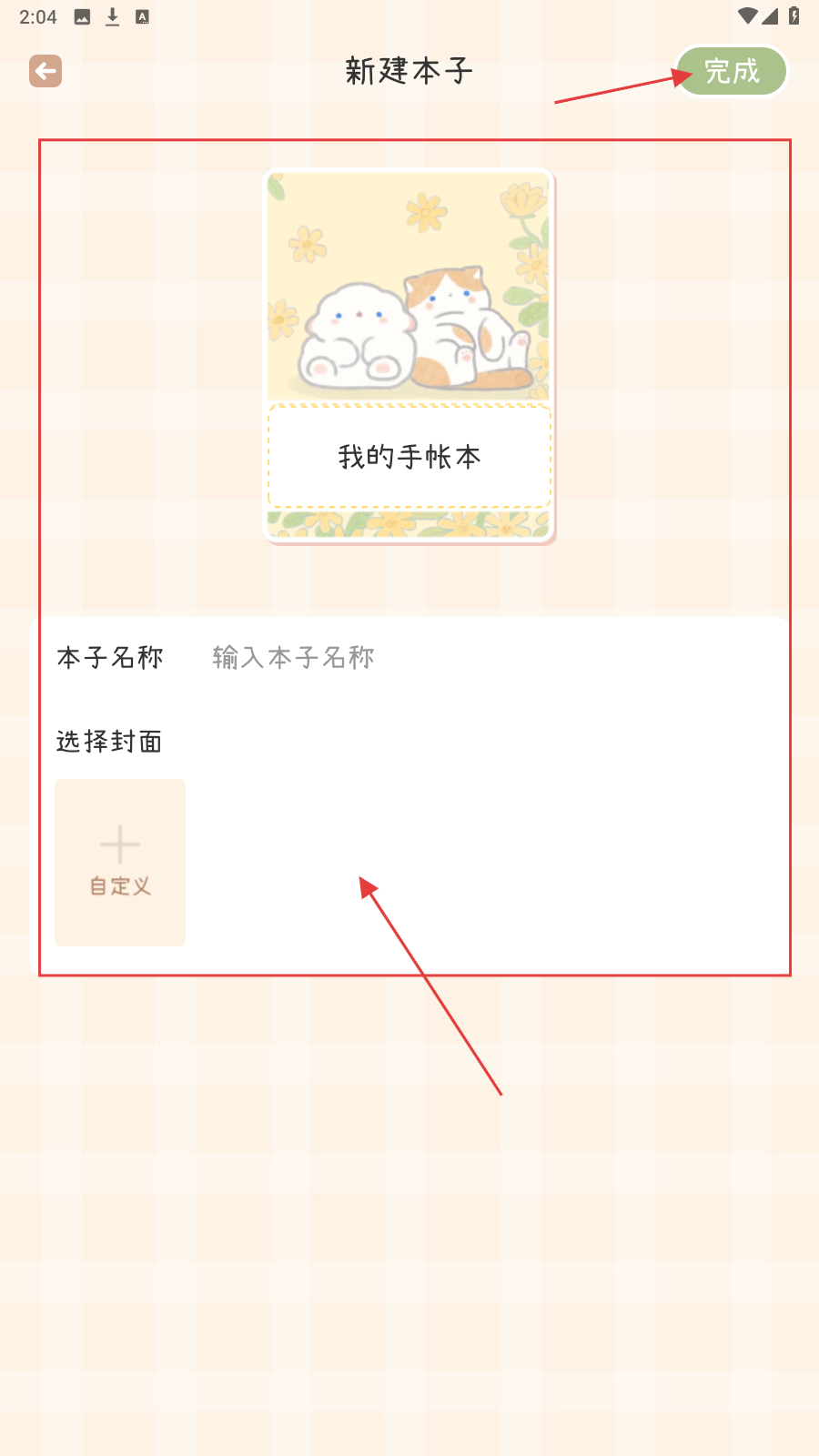 2、在【新建本子】页,输入名称、选封面,点【完成】创建手帐本。
