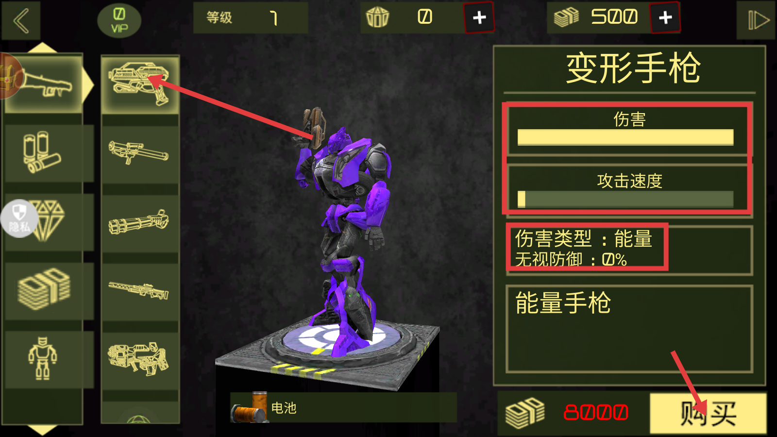 4、在装备界面优先选购【变形手枪】,提升其【伤害】与【攻击速度】属性,利用能量伤害克敌。