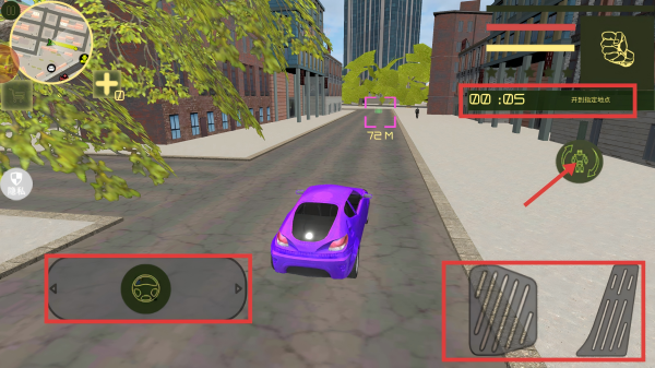 3、驾驶汽车时紧盯【00:05-开到指定地点】限时任务,善用右侧【变形】按钮应对路况,操控油门刹车。