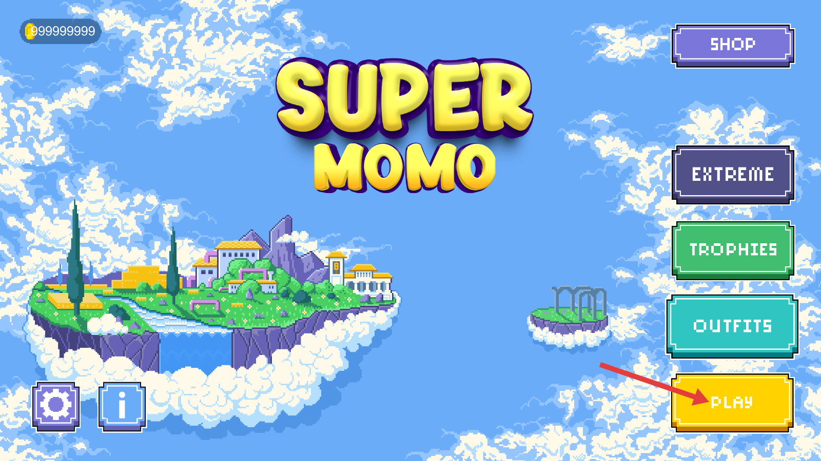 1、进入【SUPER-MOMO】主界面,优先点击【PLAY】按钮开启冒险,可先留意界面功能布局。