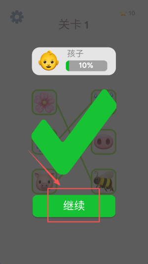 4、在进度页面点击“继续”按钮,开始下一关。