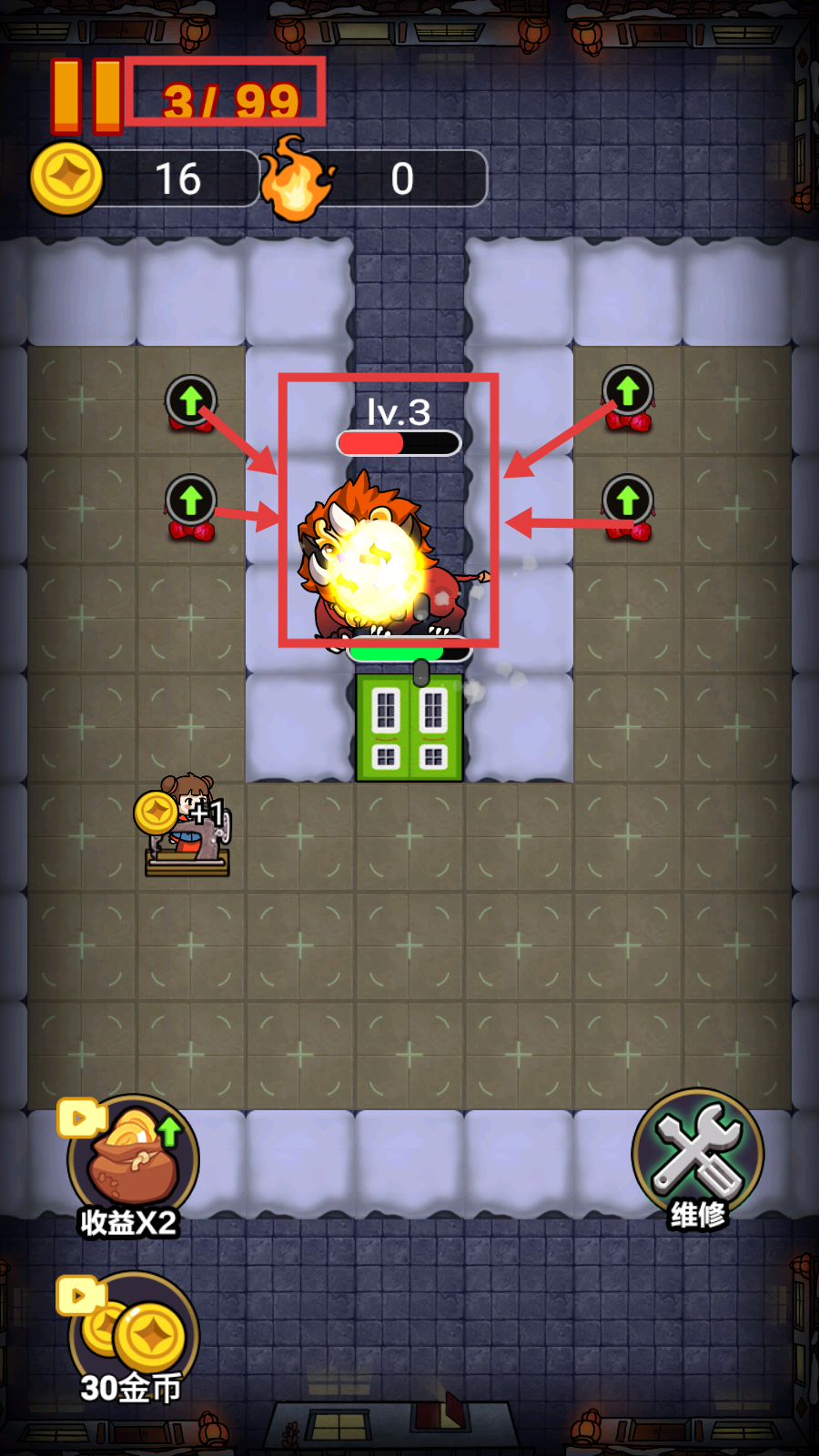 4、波次-3/99时,聚焦【Lv.3年兽】,依托周边攻击建筑,持续打击稳守防御阵线。