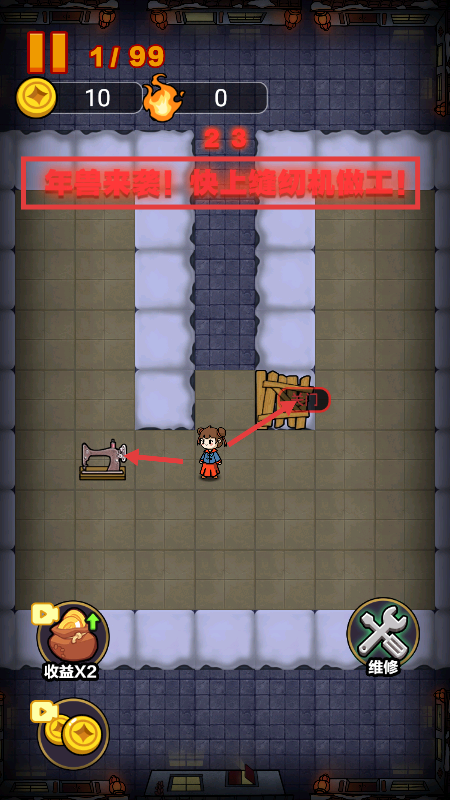 2、年兽来袭时,速上【缝纫机】做工赚金币,同时加固【木门】,为防御储备资源。