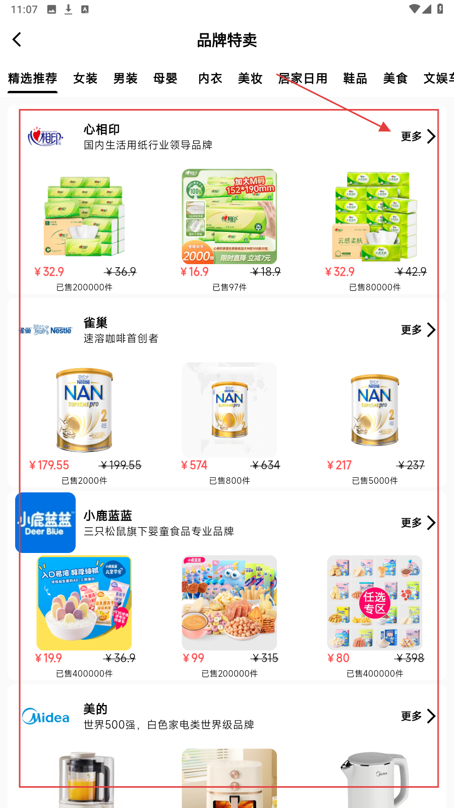 2、进入品牌特卖页,选心相印品牌栏【更多】,看纸巾等商品。