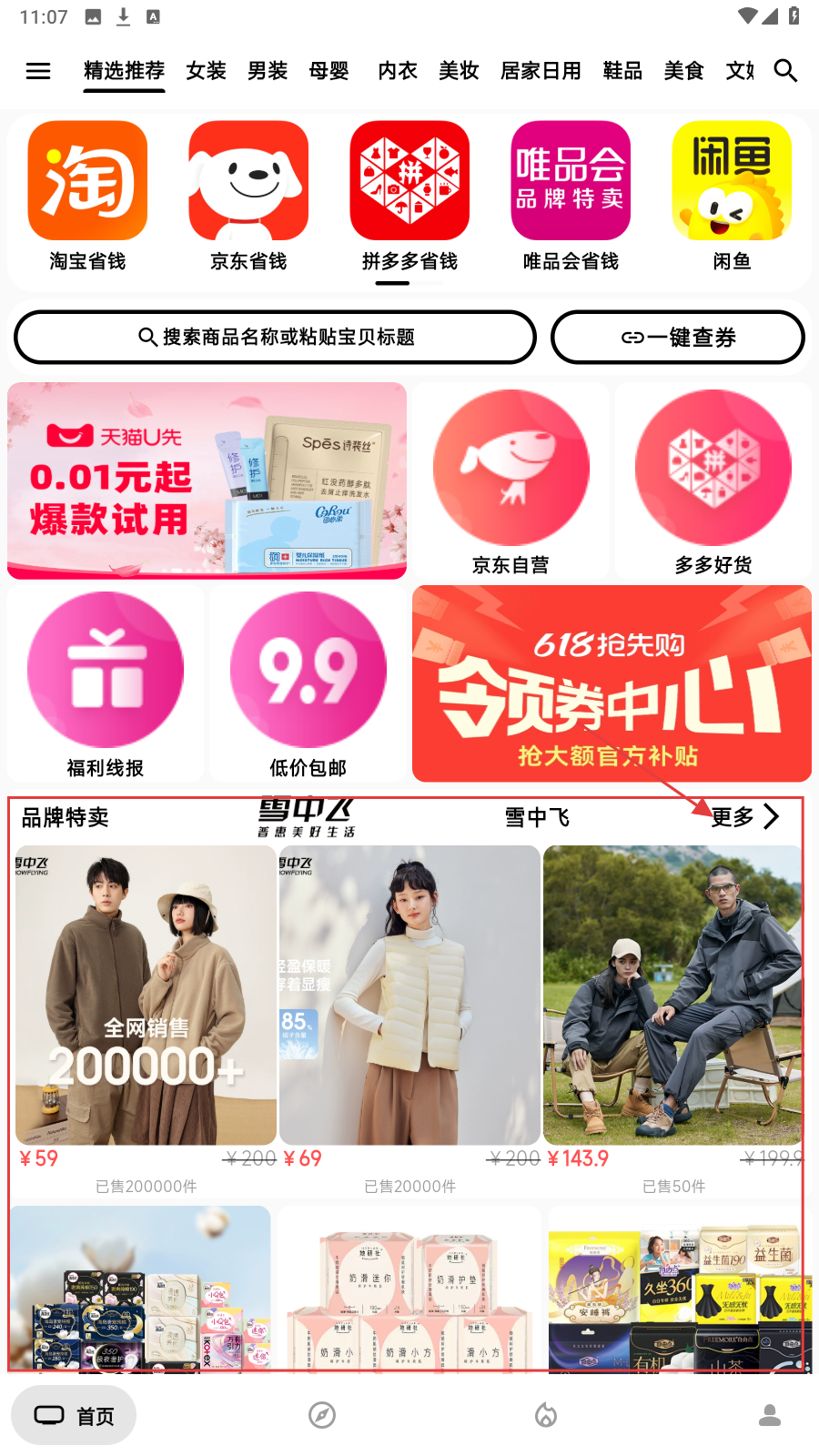 1、在首页品牌特卖区点【更多】,浏览心相印等品牌商品。
