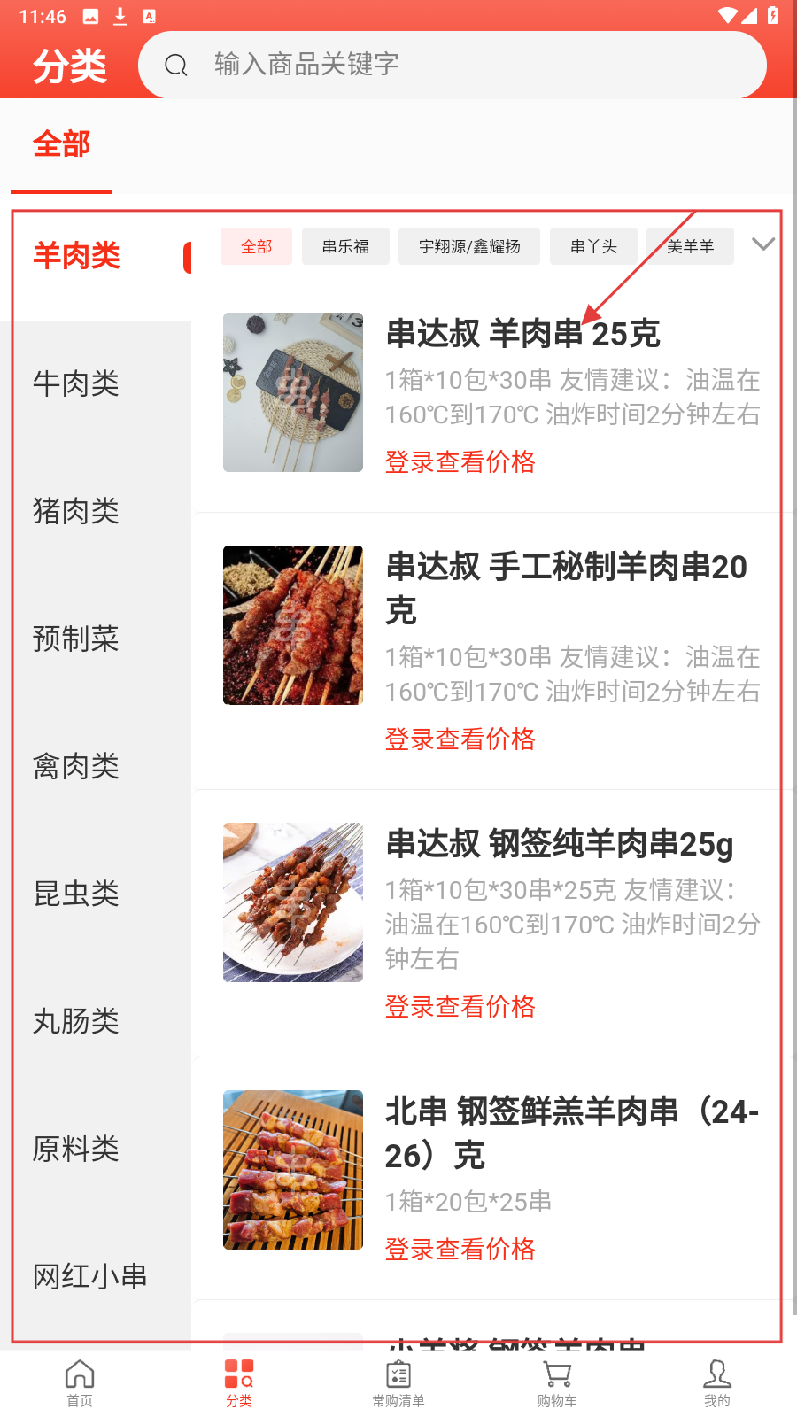 2、在【分类】页选【羊肉类】,浏览“串达叔”等品牌羊肉串,筛选心仪商品。