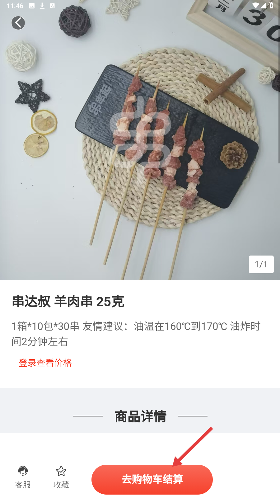 3、选中“串达叔-羊肉串-25克”,点【去购物车结算】,推进采购流程。