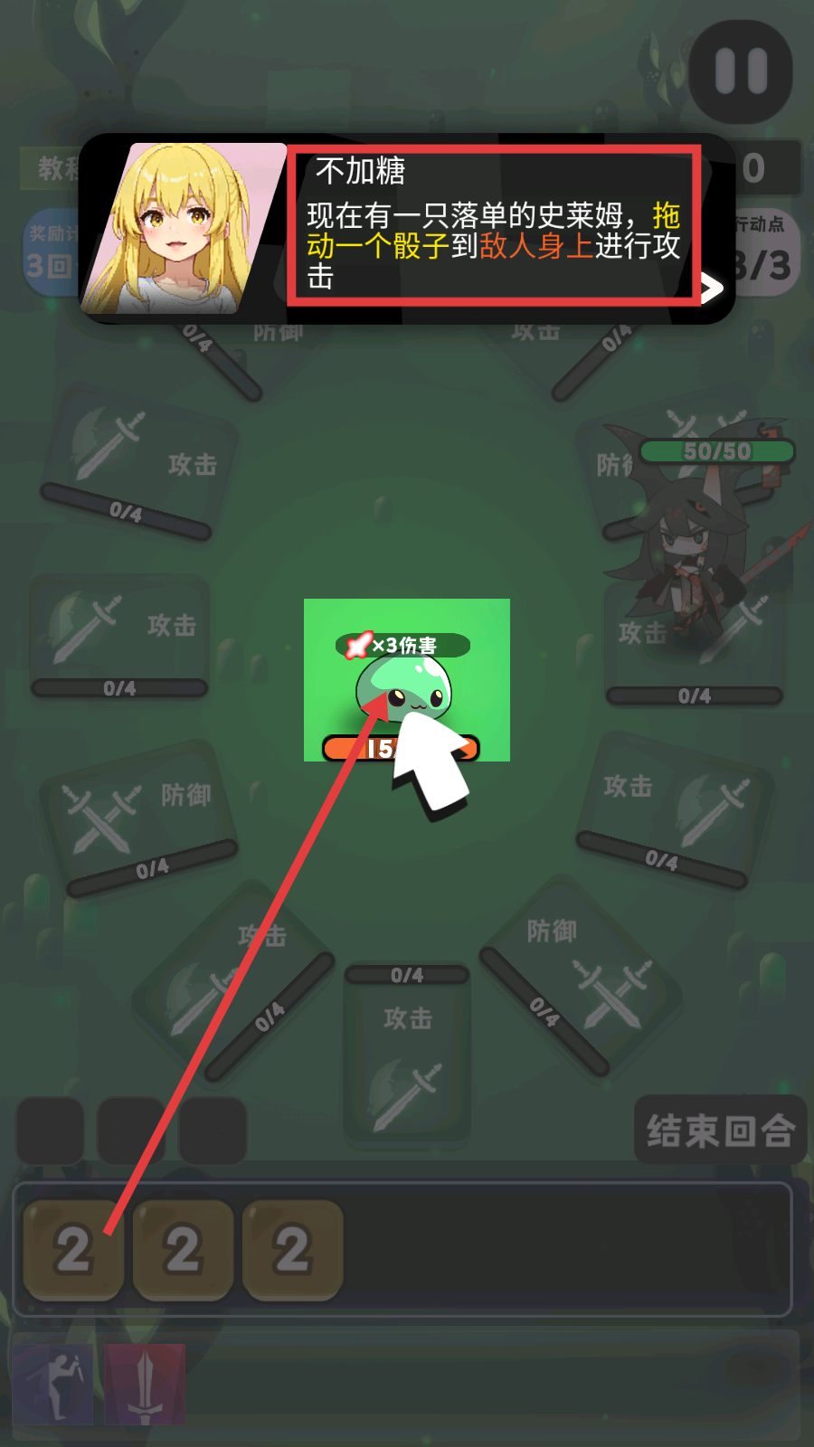 2、跟随指引,拖动底部【2】骰子至【史莱姆】处,触发攻击,初步熟悉战斗操作。