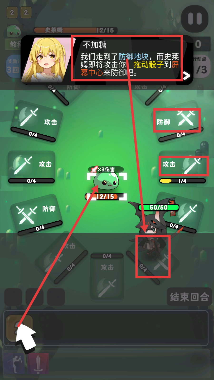 3、处于防御地块时,拖动骰子到屏幕中心,提升防御能力,抵御史莱姆的进攻威胁。
