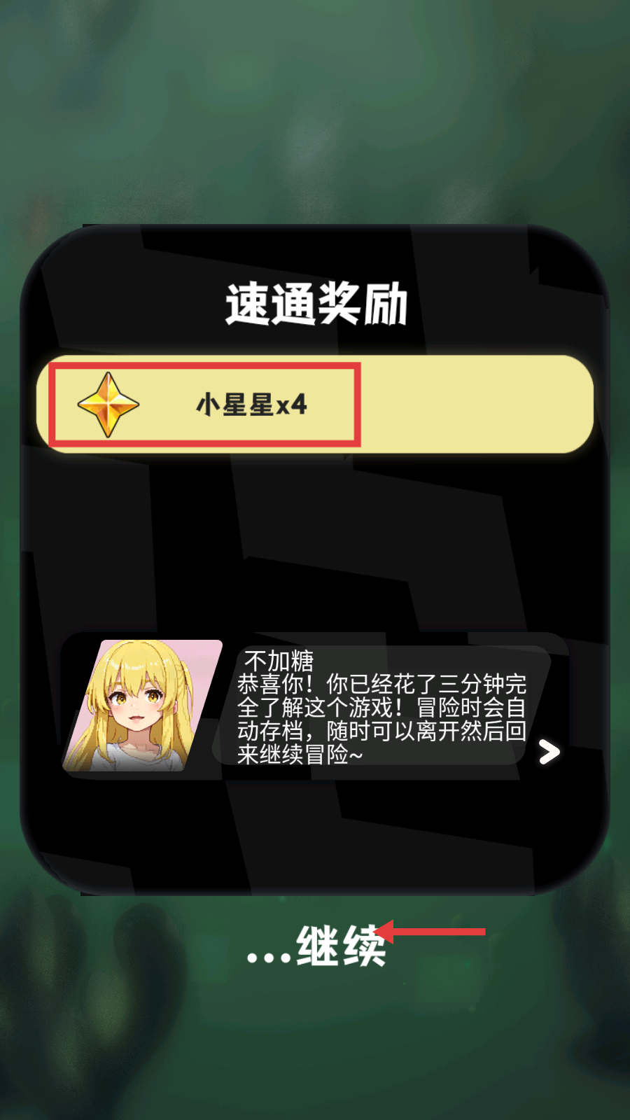 4、完成教程得【小星星x4】,点击【…继续】,游戏自动存档,支持随时退出后续再启冒险。