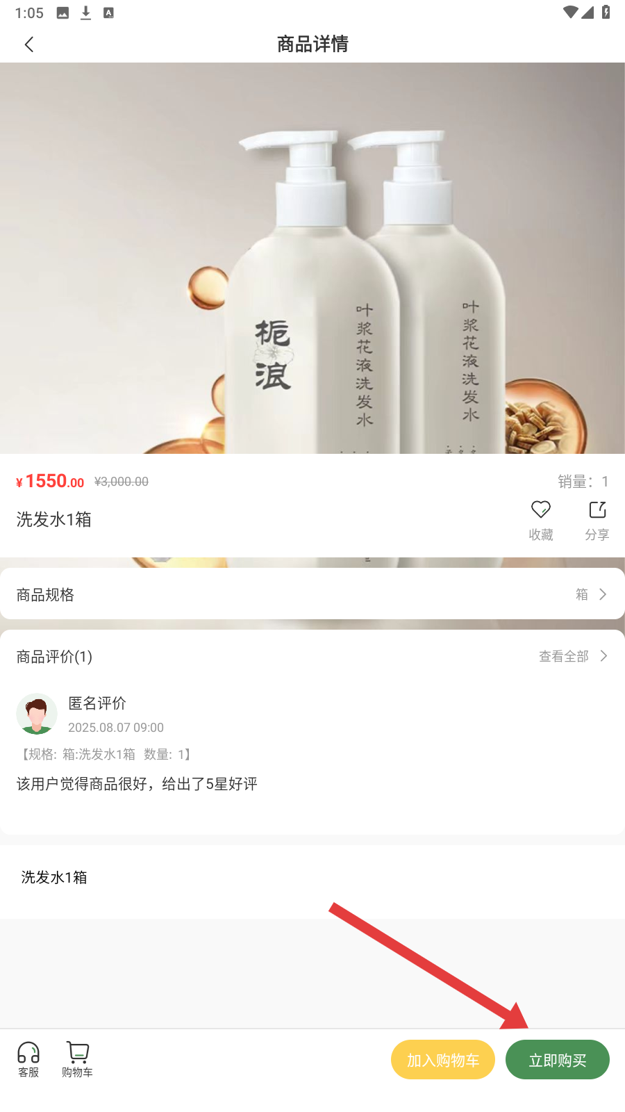 3、进入商品详情,确认“洗发水1箱”信息后,点【立即购买】推进交易。