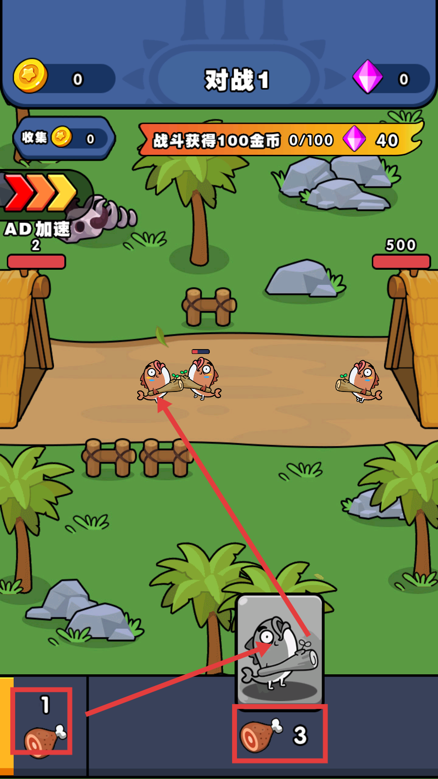 2、消耗【鸡腿-3】召唤下方单位,派遣至中路抗敌,借助【AD加速-2】提升作战效率。