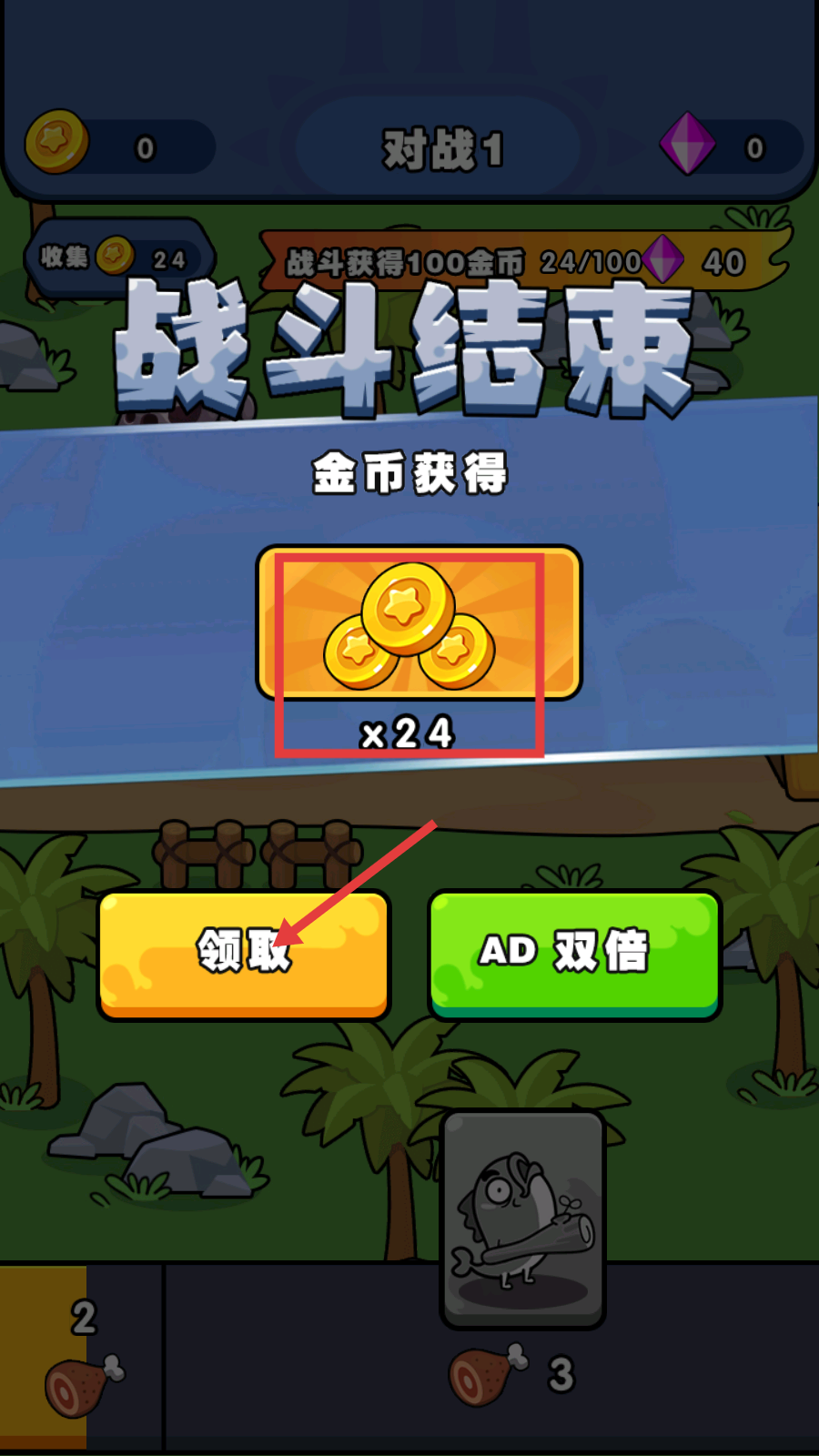 4、挑战结束点击黄色【领取】按钮,获取【金币-x24】,也可选【AD双倍】看广告翻倍,优先领资源。