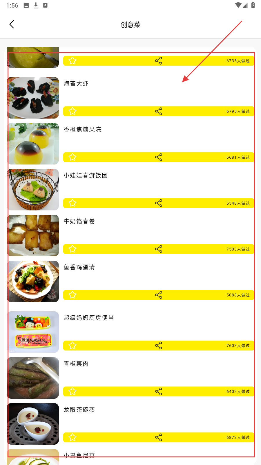2、在【创意菜】列表,选感兴趣菜品(如海苔大虾),查看详情。