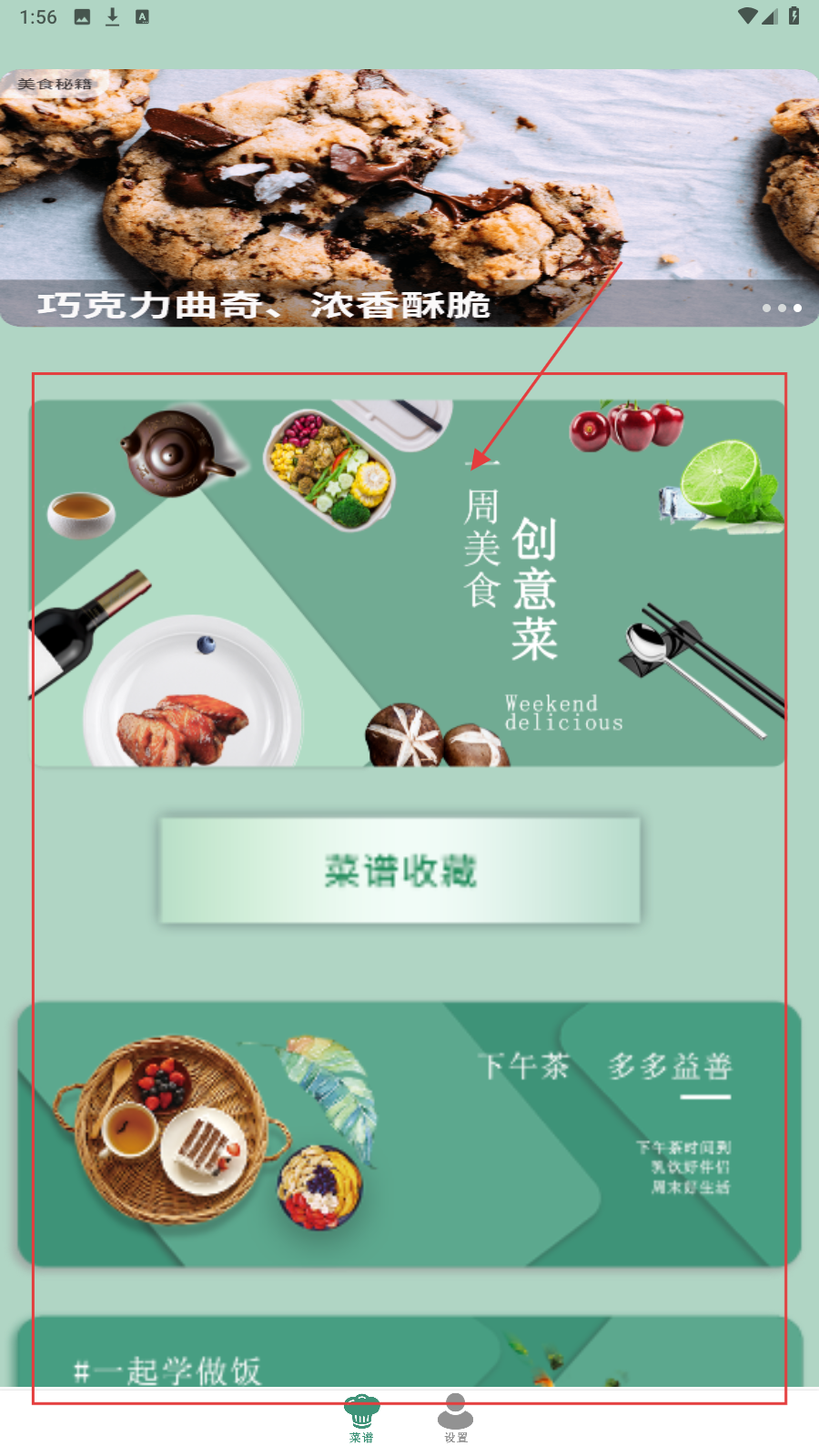 1、进入【菜谱】页,点【周美食-创意菜】板块,浏览创意菜合集。