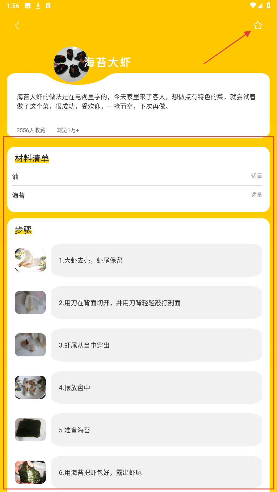 3、进入菜品详情,看材料清单、步骤,点右上角【收藏】存菜谱。