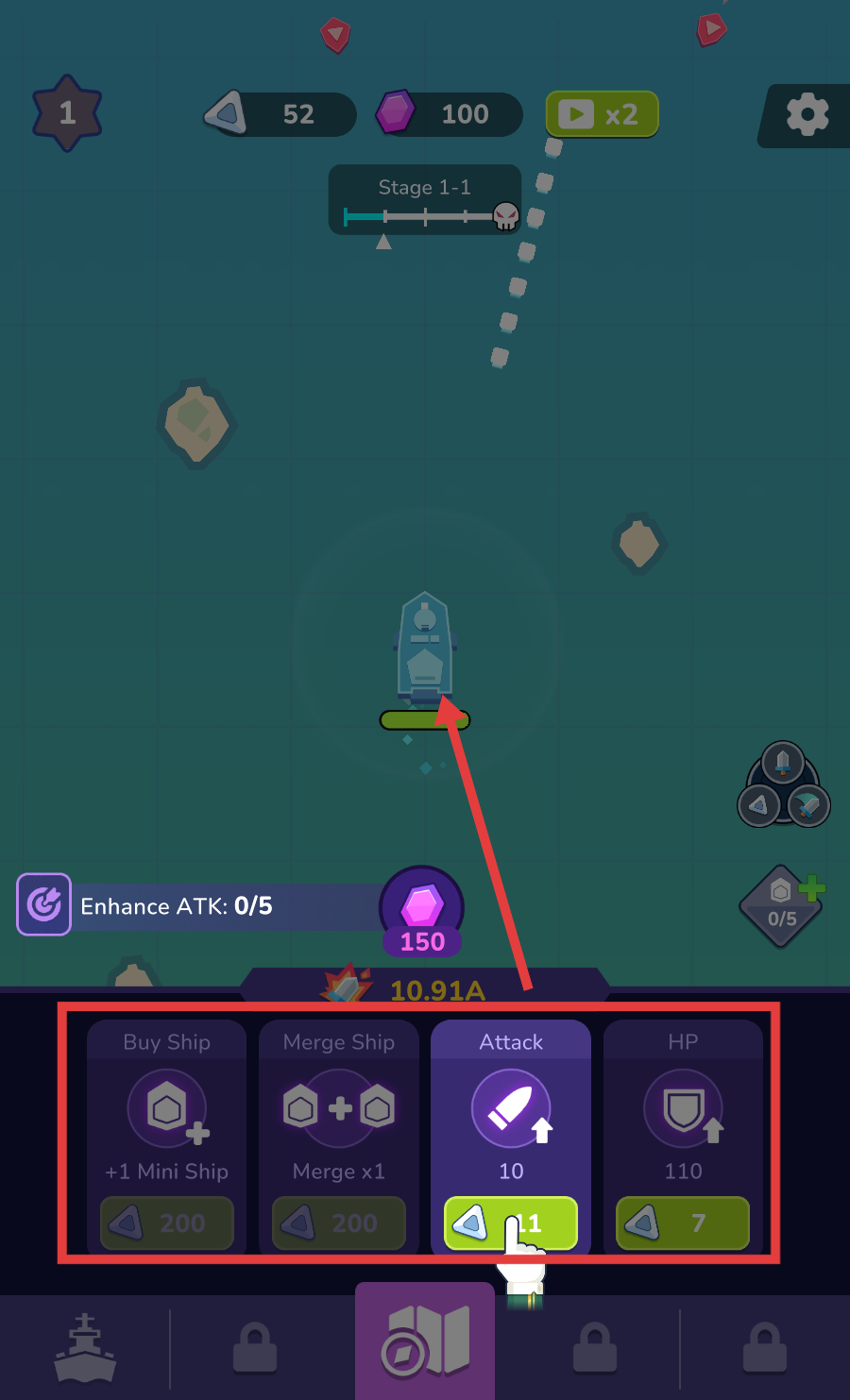 1、战斗初期优先点【Attack】提升舰船攻击力,消耗【三角形资源】增强输出,应对Stage-1-1敌人。