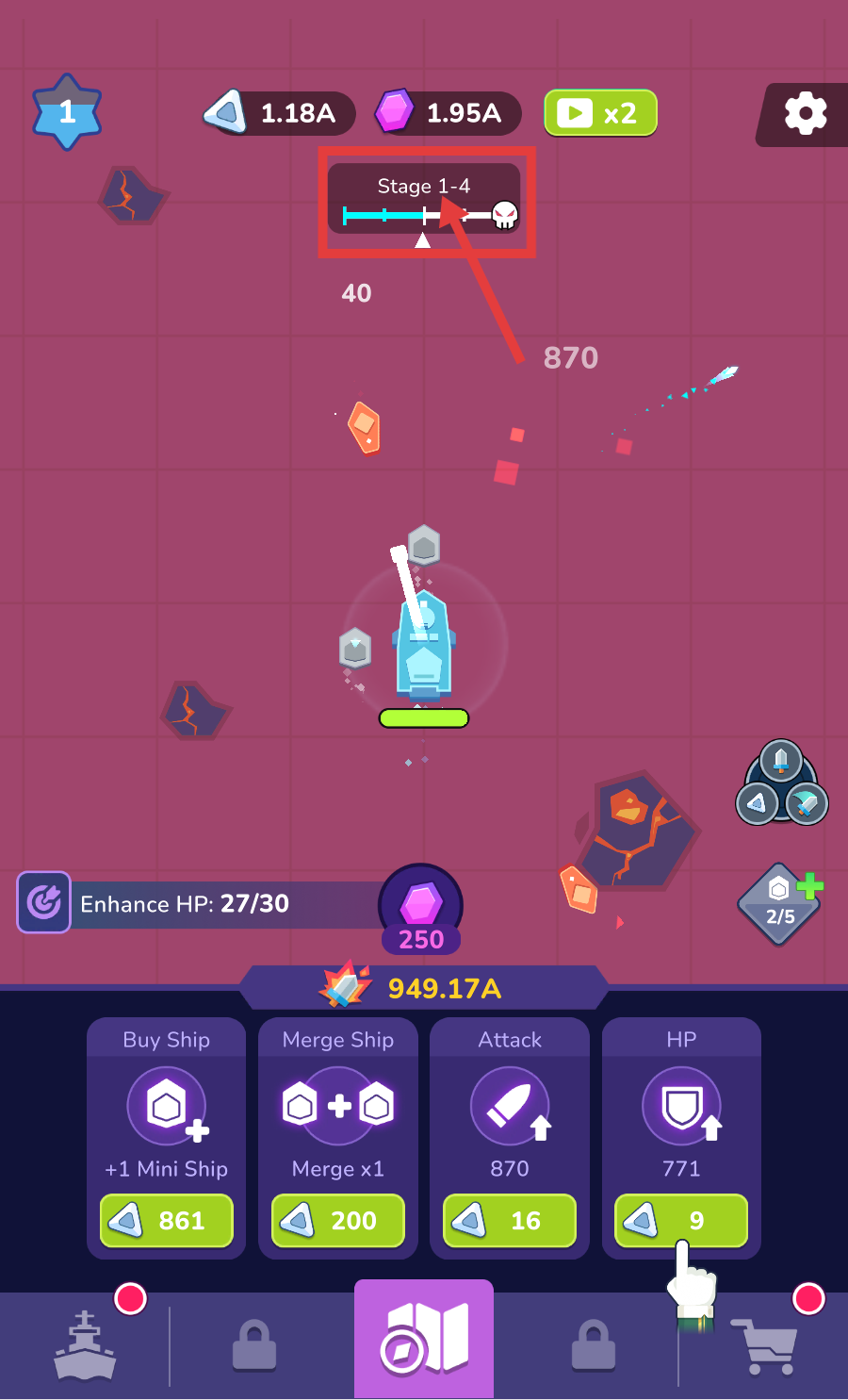 4、推进至【Stage-1-4】阶段,优先升级【HP】提升舰船生存,搭配Buy-Ship扩充舰队规模。