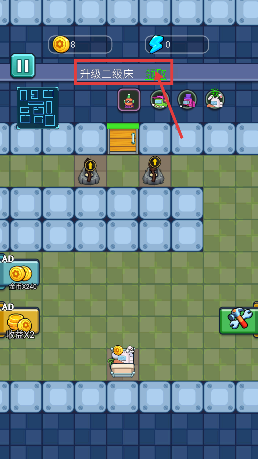 4、攒资源后点上方【升级二级床-领取】,提升床收益,为后续发展攒基础资源。