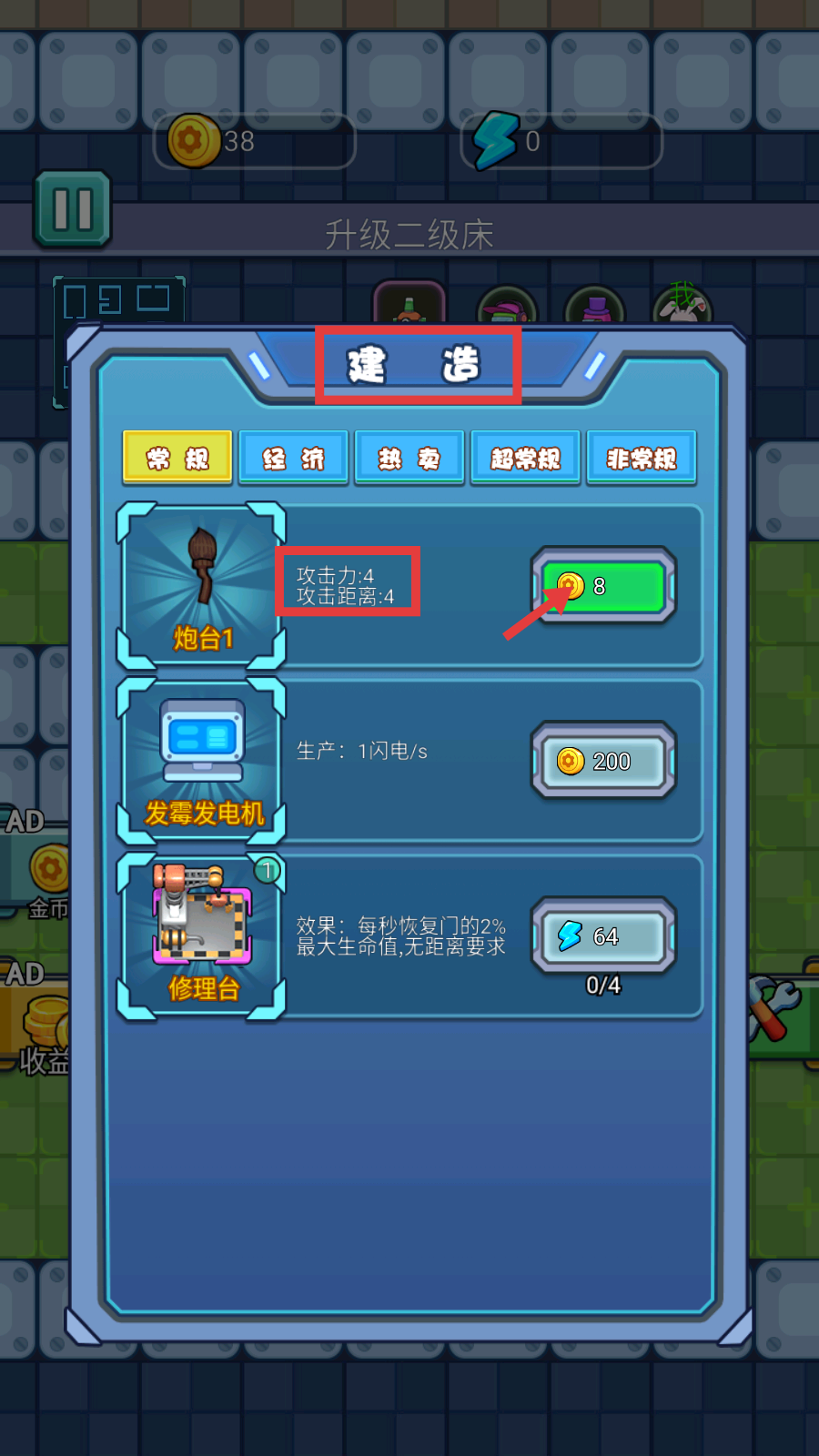 3、打开【建造】界面,花8金币造【炮台1-攻击力:4-攻击距离:4】,提升防御抗梦魇。