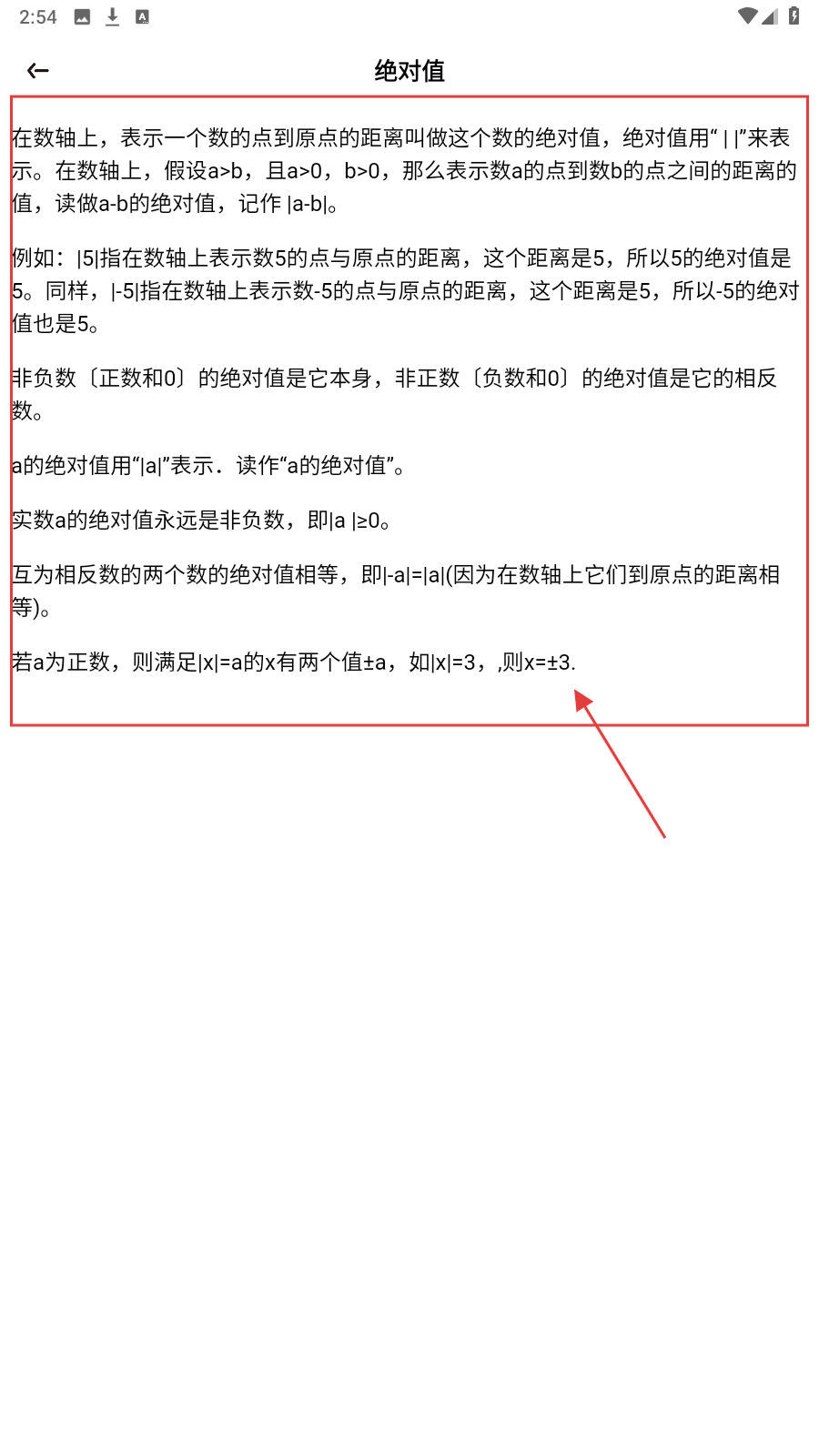 2、查看【绝对值】详情页,记数轴上距离概念、非负性等要点,掌握性质。