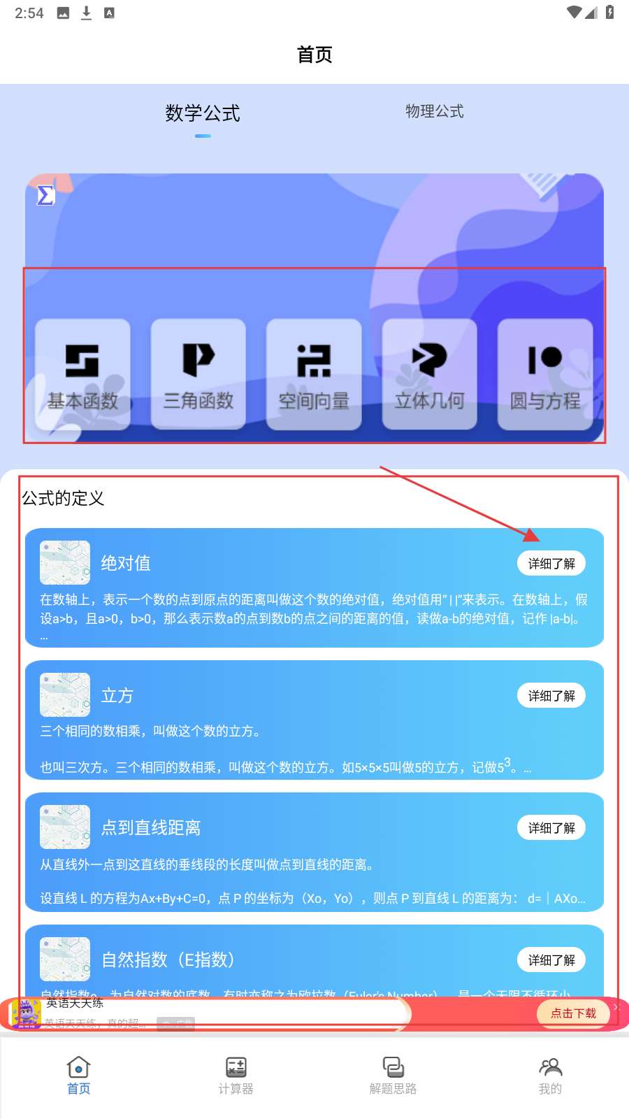1、进入首页【数学公式】,选【基本函数】等分类,点公式右侧【详细了解】,深入学定义。