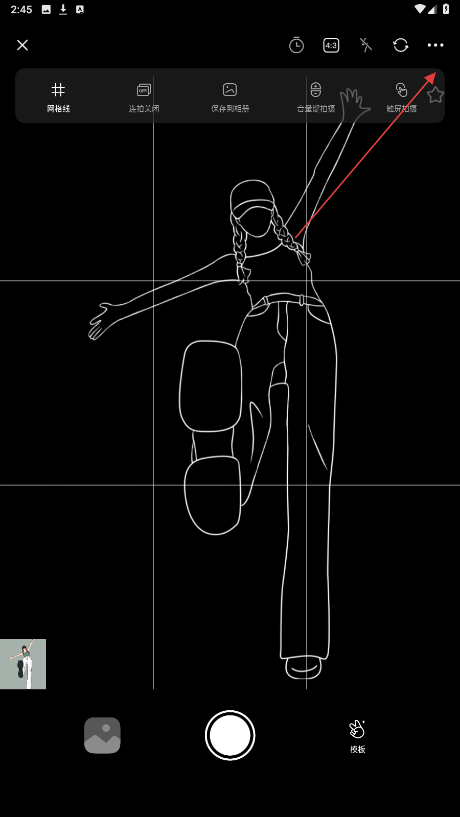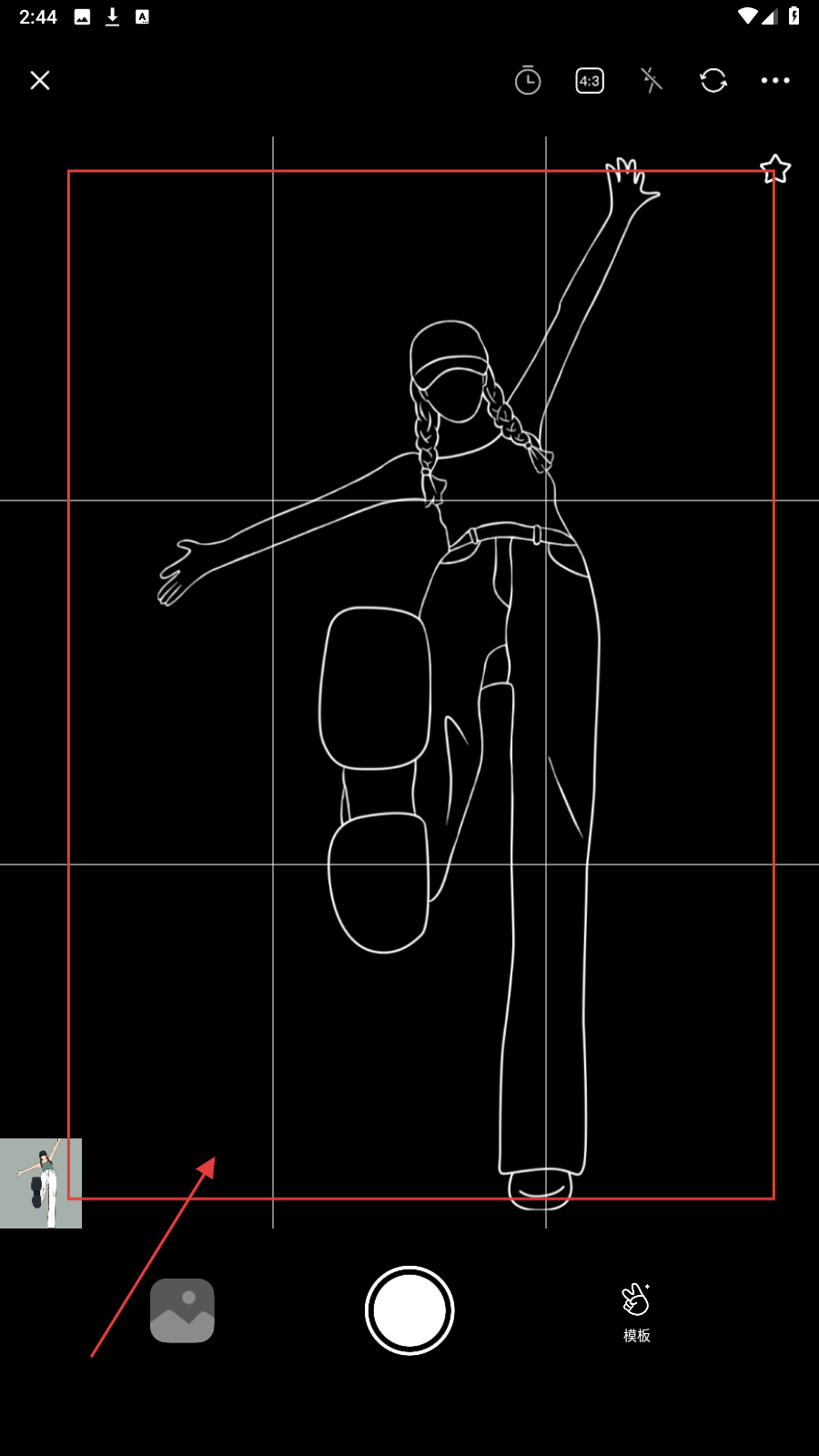3、进入拍摄页,按模板轮廓摆姿势,用网格线辅助对齐,调整站位。