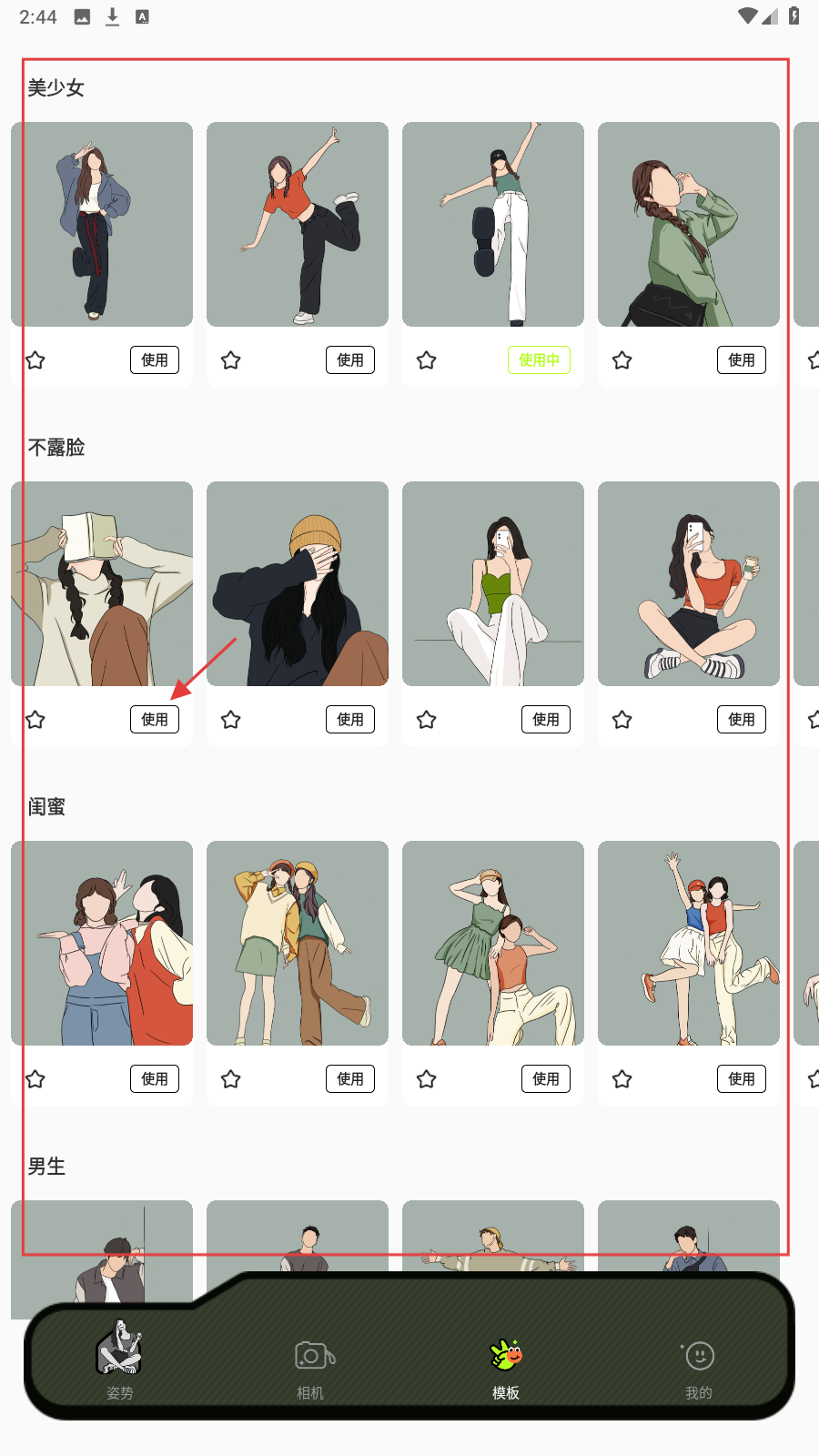 2、切到【模板】页,选分类(美少女、不露脸等),点【使用】心仪模板。